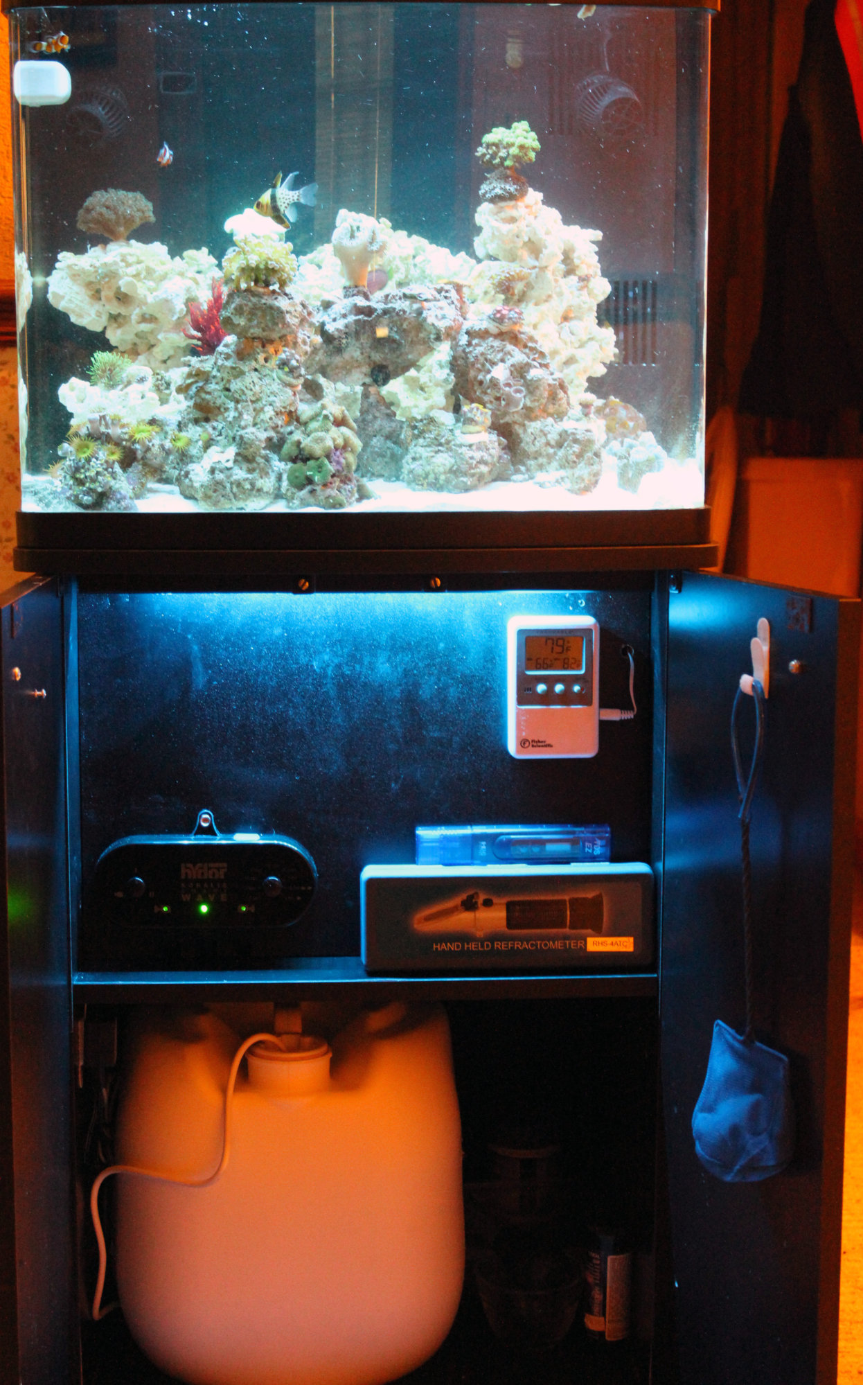Temp probe, hydor wavemaker, Tunze auto top off. Led cabinet lighting